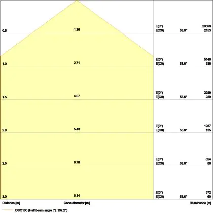 De gradenbundel geeft informatie over hoe breed het licht wordt uitgestraald. Dit zit tussen de 0 en 360 graden (D). Hoe kleiner de hoek, hoe specifieker de lichtbundel is. Over het algemeen is een smalle gradenbundel perfect voor sfeer- of accentverlichting, terwijl een brede gradenbundel ideaal is om grote oppervlaktes te verlichten.